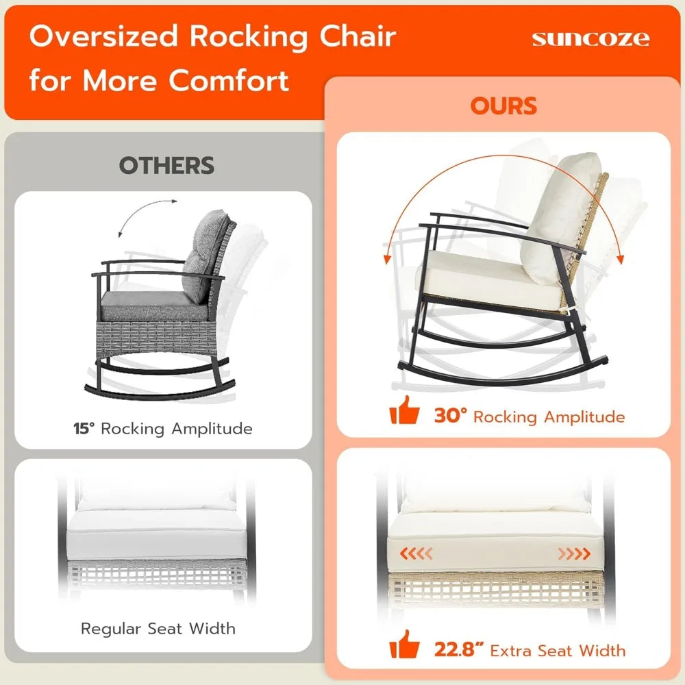 Transform your outdoor space with the ANGDUO 3-piece patio rocking set, where modern style meets cloud-soft comfort for leisurely days and starry nights.