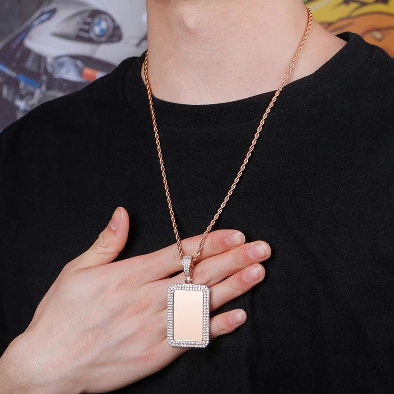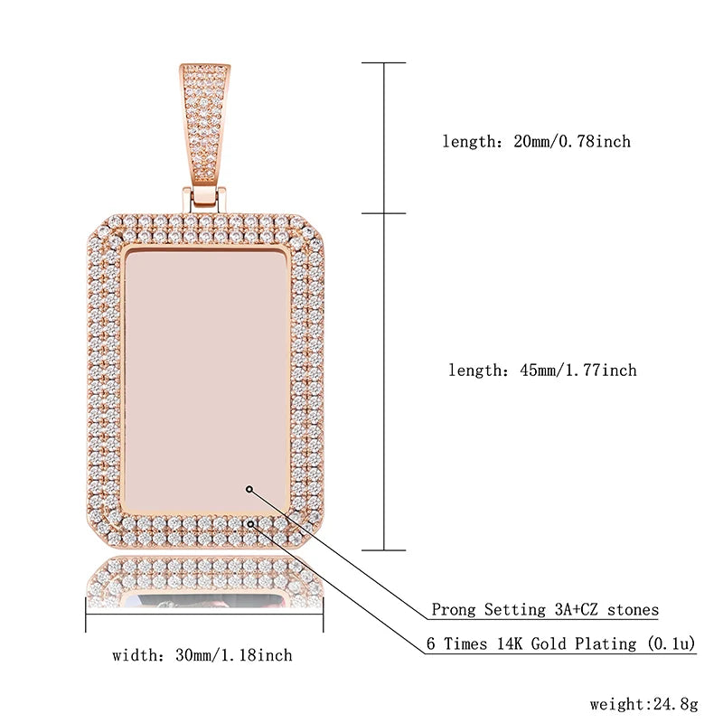 - Customizable square pendant (30mm × 45mm) houses your photo and is accented with icy cubic zirconia for standout sparkle that lasts.