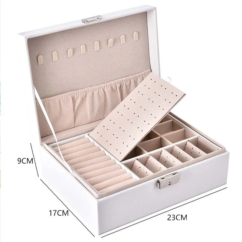 - Premium leather exterior meets a plush velvet tray, safeguarding rings, bracelets, and necklaces from scratches while presenting your pieces with subtle luxury.