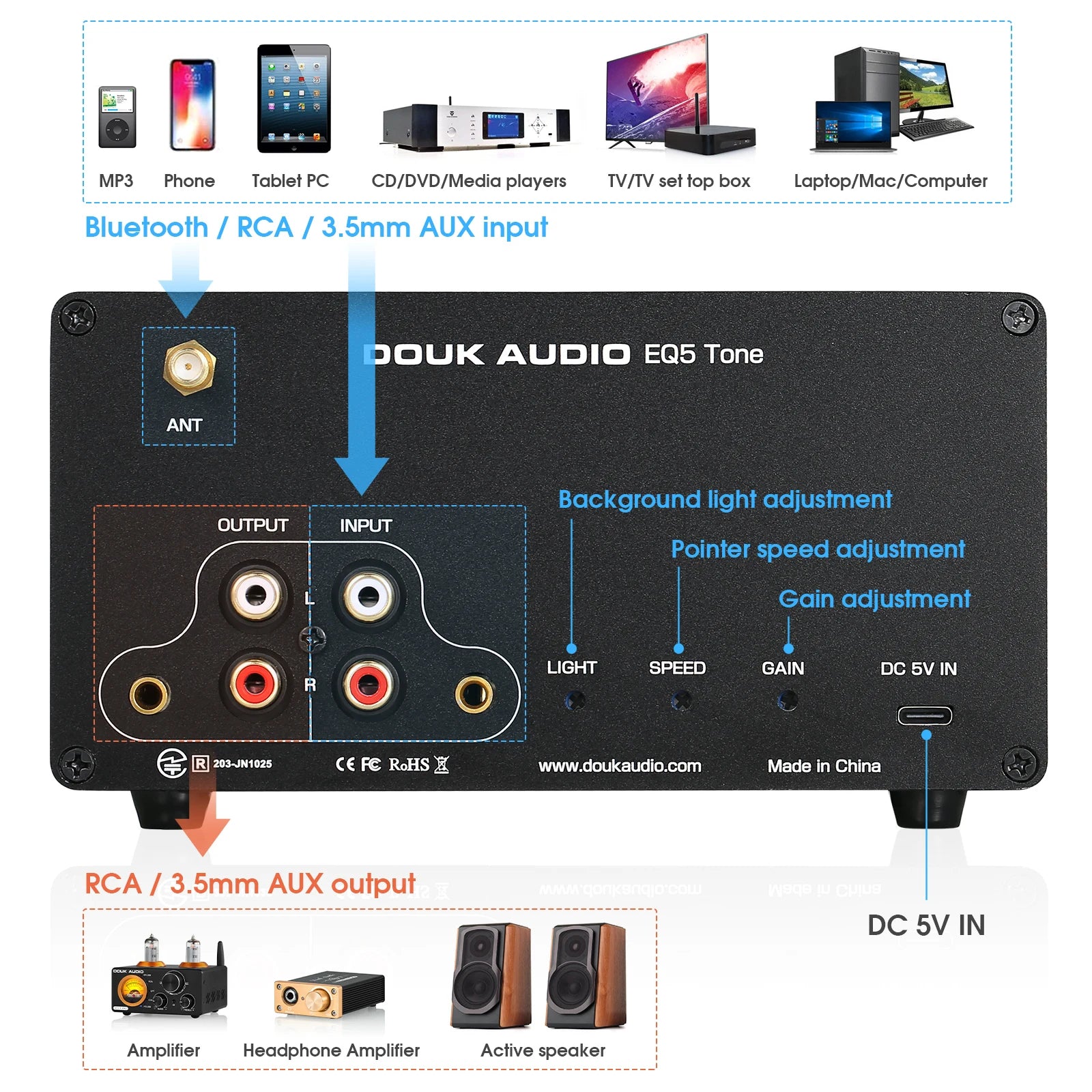 Elevate your listening with the Douk Audio EQ5 Pro Mini, a compact 5-band Bluetooth desk preamp that puts precise tone control at your fingertips, ideal for mastering, mixing, and everyday music enjoyment.
