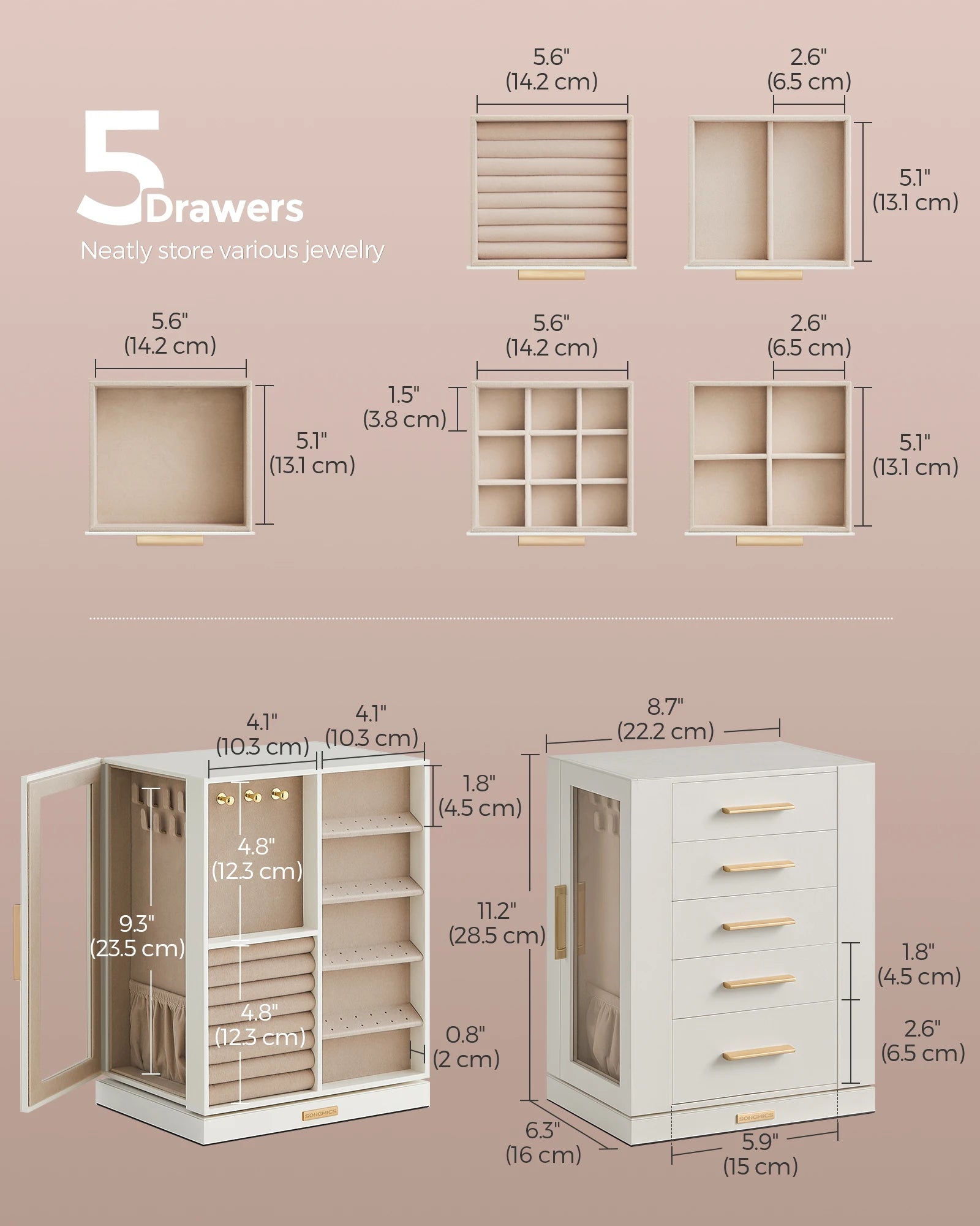 - Spacious, versatile layout features ring slots, necklace hooks (18 total), stud earring holes, plus 5 drawers for brooches and hair accessories, all within a compact 6.3"D x 8.7"W x 11.2"H frame (16 x 22.2 x 28.5 cm).