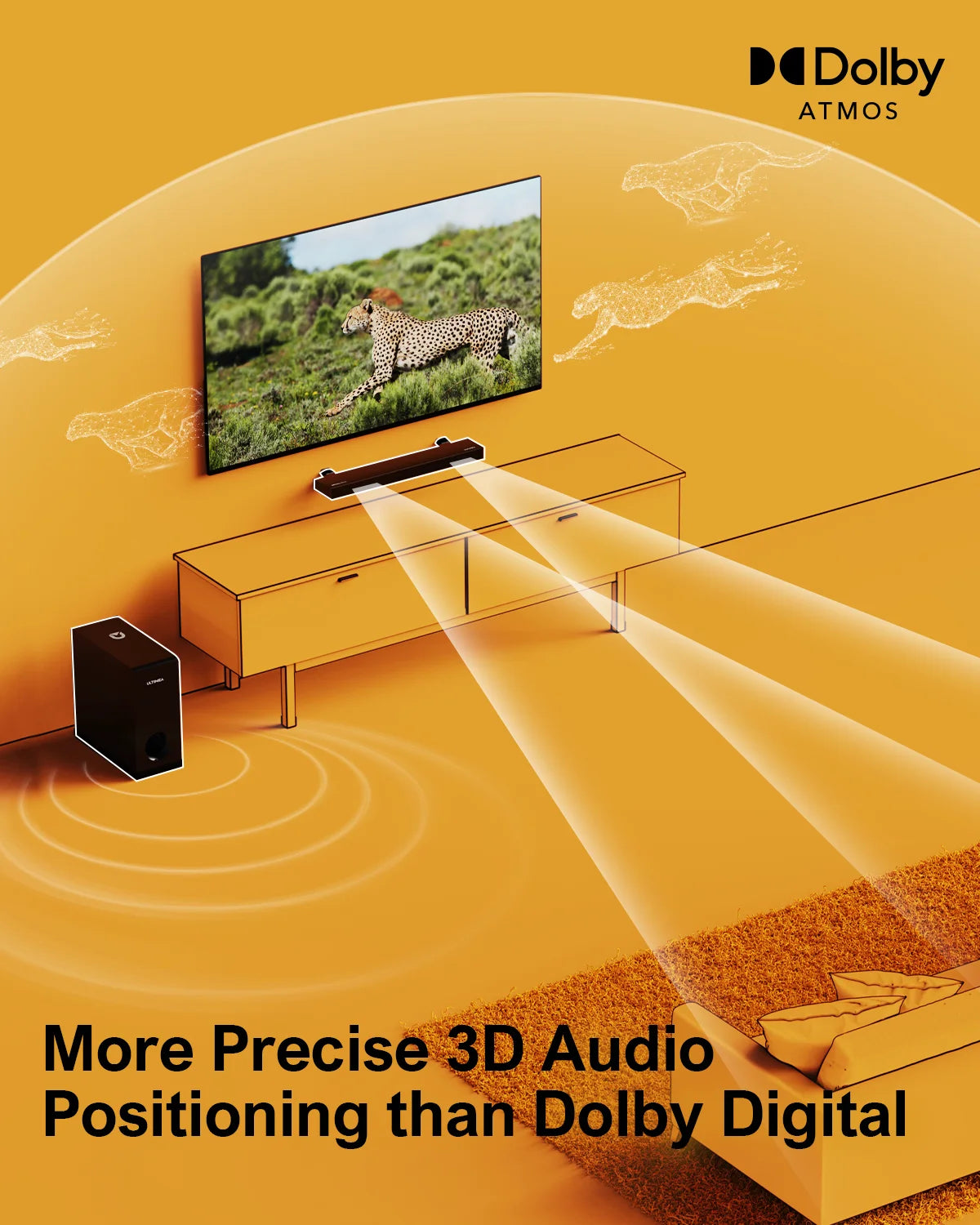 Experience cinematic Dolby Atmos immersion with the ULTIMEA 2 1 Soundbar, delivering deep bass, crystal-clear highs, and room-filling sound in a compact 3-channel 2.1 package.